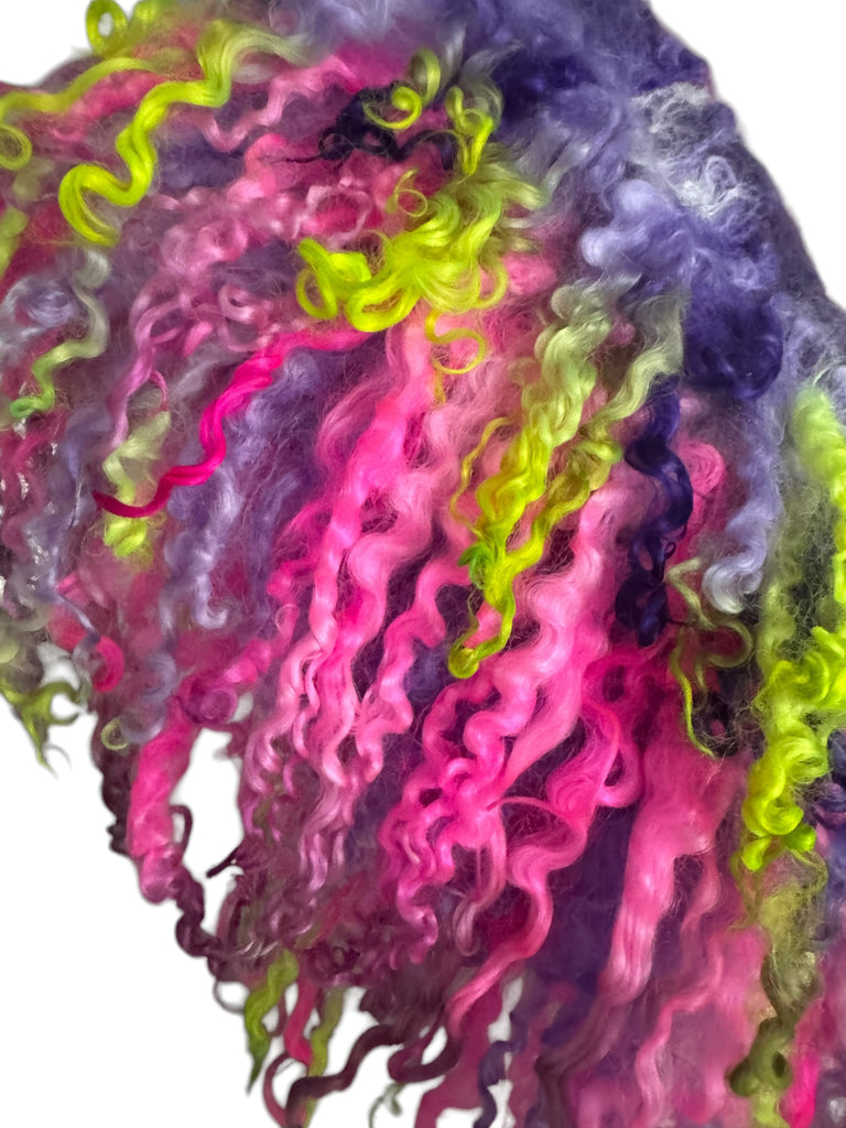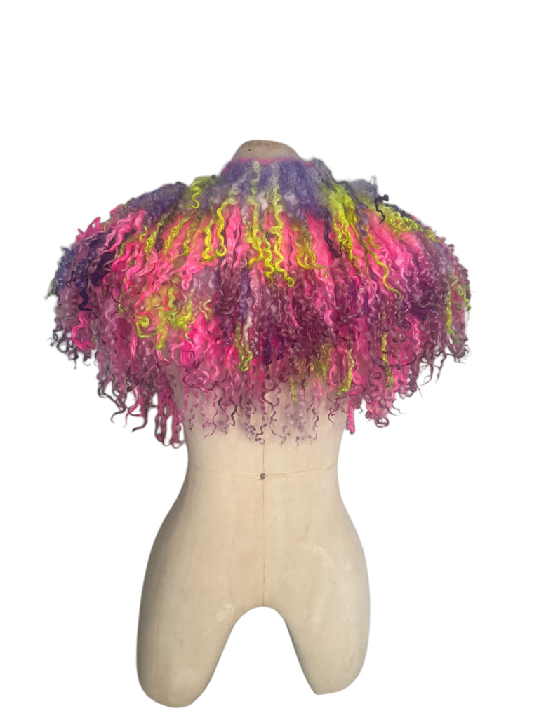 Indie Hand Dyed Pure Wool Locks Curly Caplet Shawl Fluorescent Pink, Purple & Acid Green