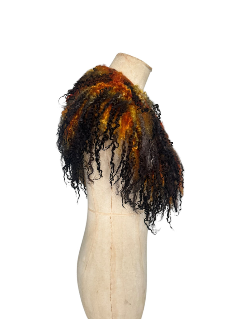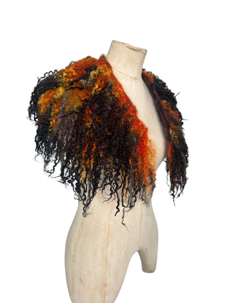 Enhance your wardrobe with our Curly Caplet Statement Wool Collar. Crafted from natural wool and hand dyed in black and orange, mixing to create wonderful brown and yellow tones, this striking fashion piece showcases curly locks from Teeswater sheep, skilfully wet and needle felted for a bold appearance. Stand out from the crowd with this exceptional accessory.