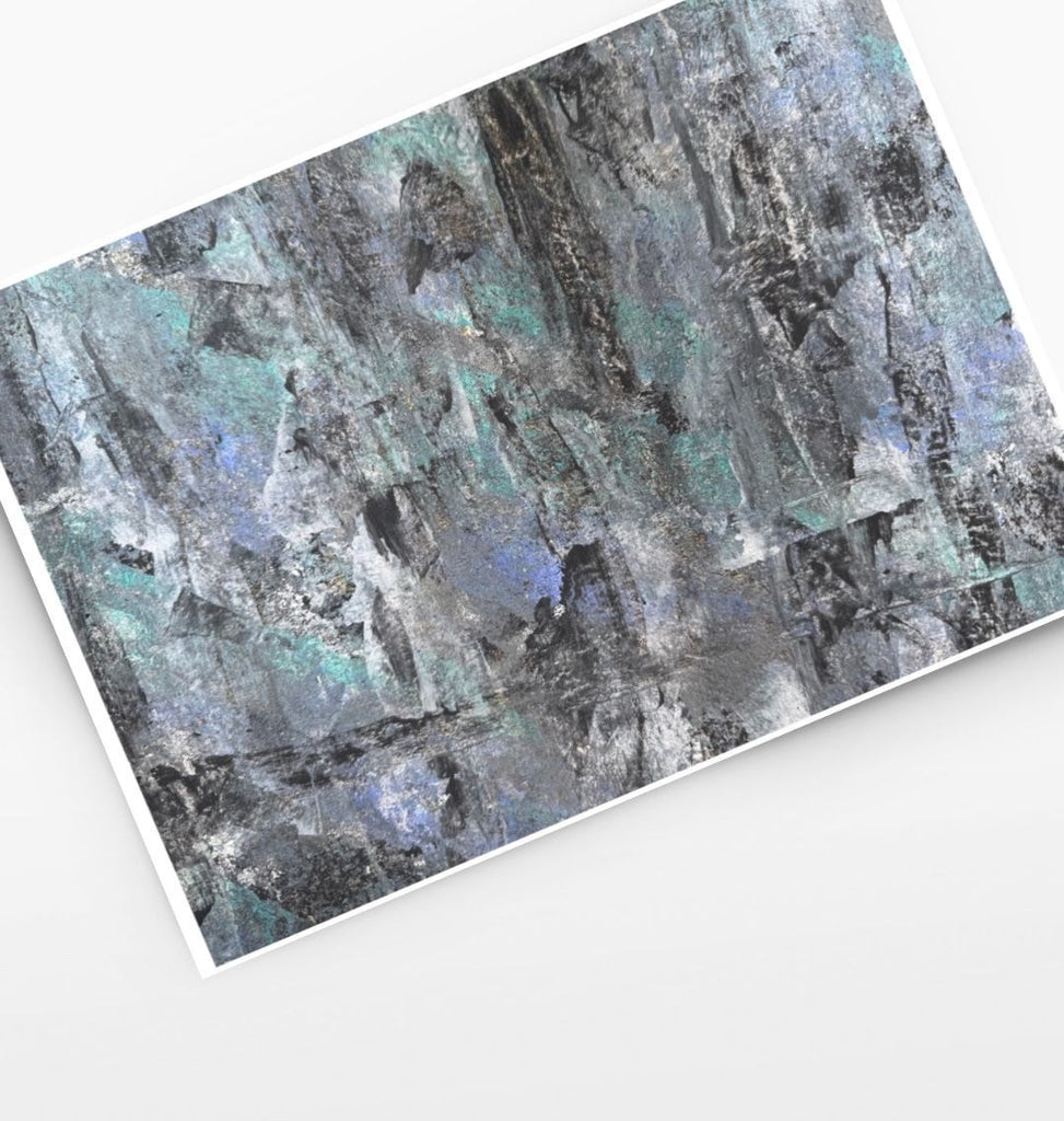Bring depth and drama into your home with Raven Wings, an original mixed media abstract painting print. Rich layers of black, charcoal and silver are lifted with flashes of blue and teal, echoing the iridescent sheen of raven feathers in flight.